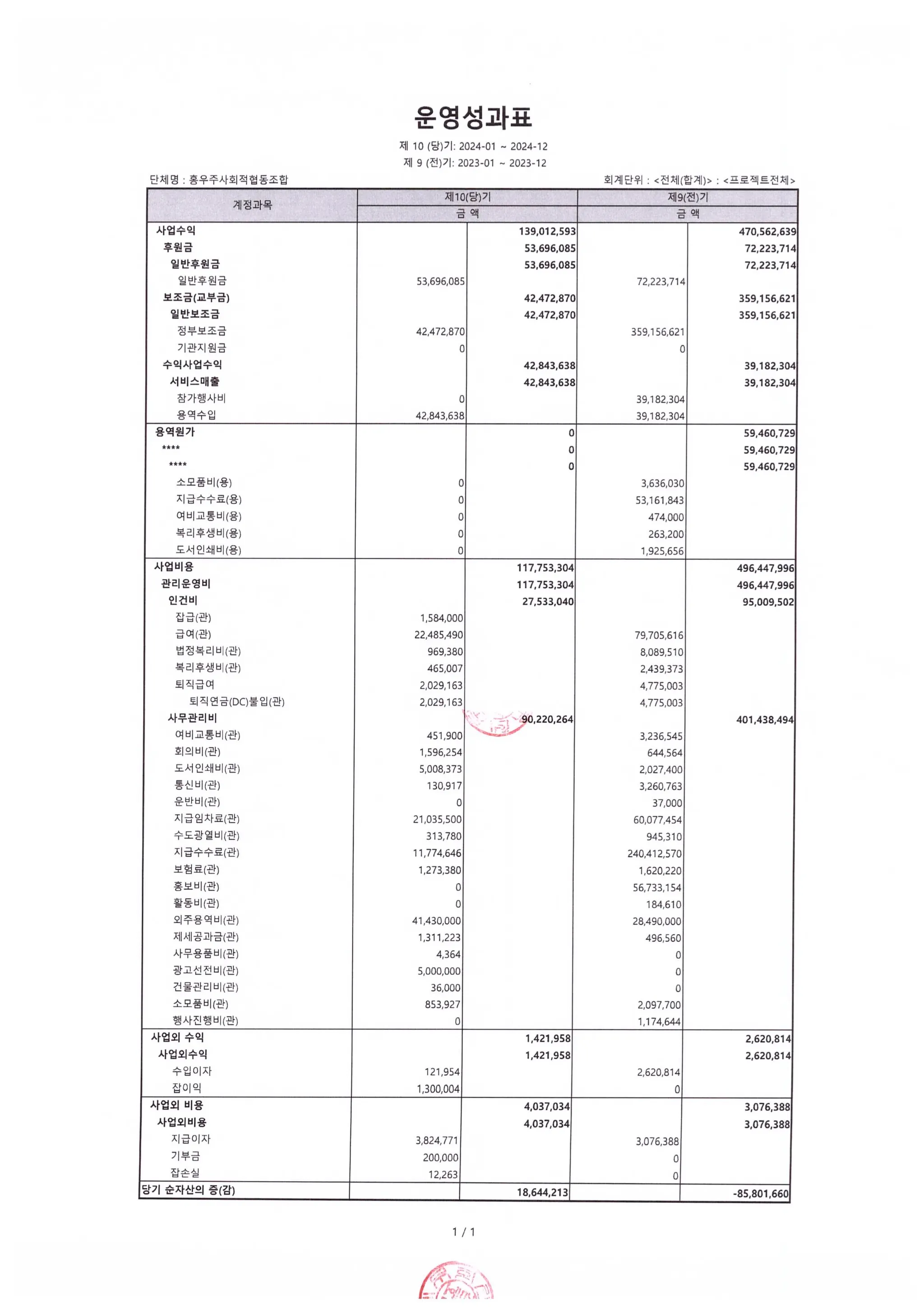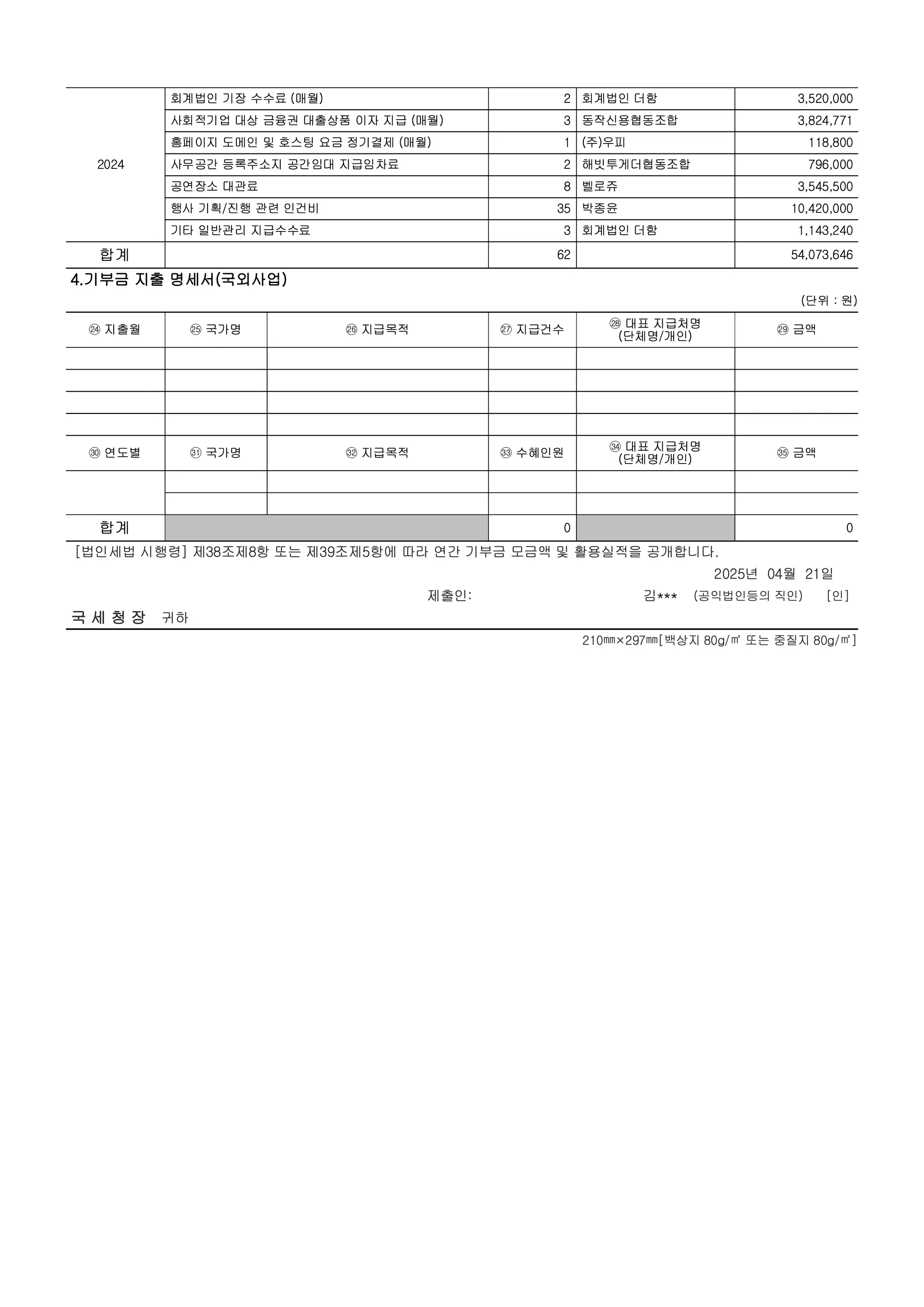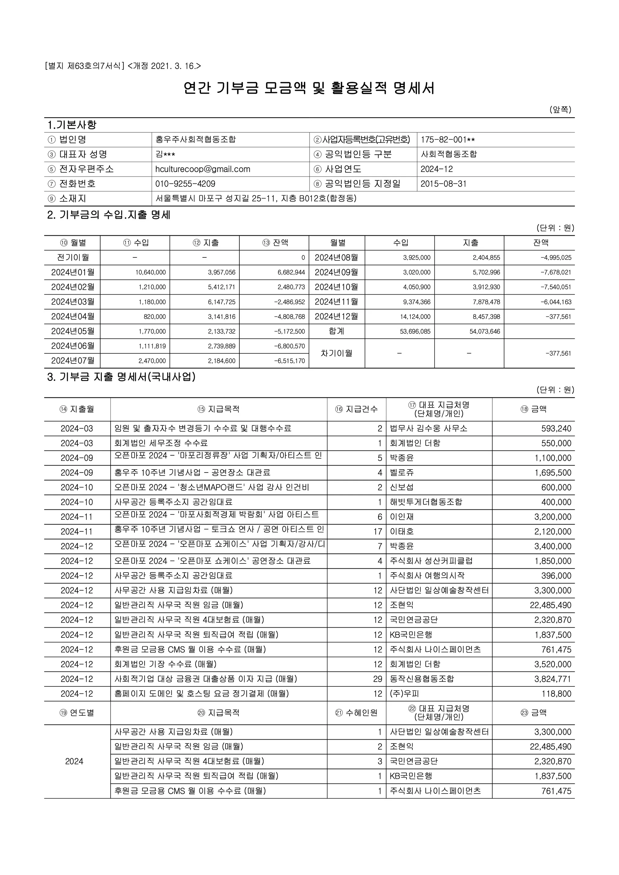 2024년 제10회기의 결산 재무제표, 연간 기부금 모금액 및 활용실적 명세서 등을 홈페이지에 공시합니다.