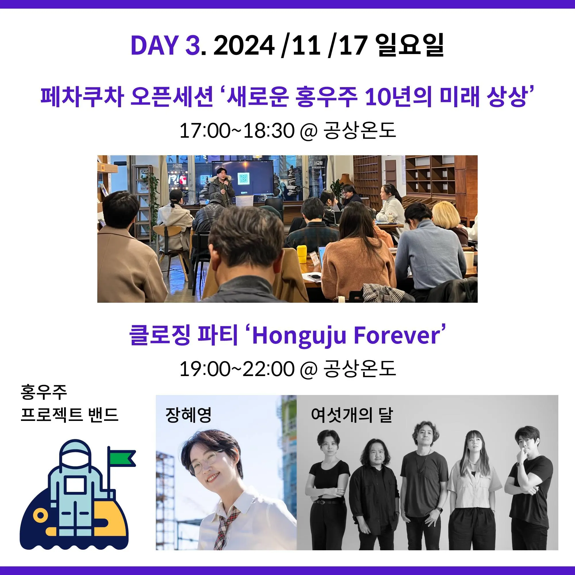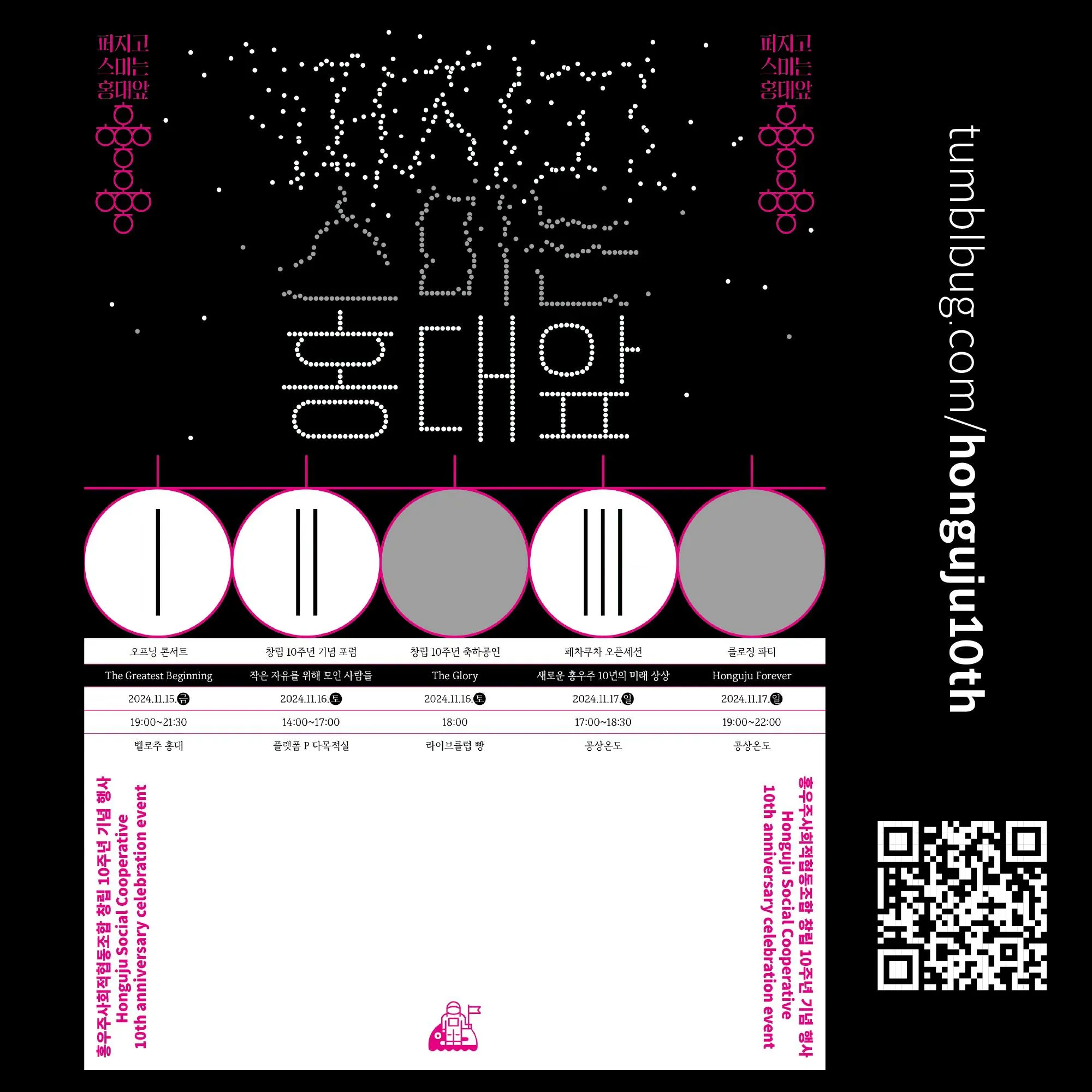 토크쇼, 라이브공연, 포럼, 페차쿠차, 파티 등을 아우르는 그야말로 홍우주스러움을 보여줄 수 있는 프로그램들로 가득 채운 이번 행사는 홍우주를 구성하고 있는 조합원 뿐 아니라 이제껏 홍우주가 걸어온 길을 곁에서 지켜보고 동행해준 친구, 동료들과 함께 하는 자리가 될 것입니다.