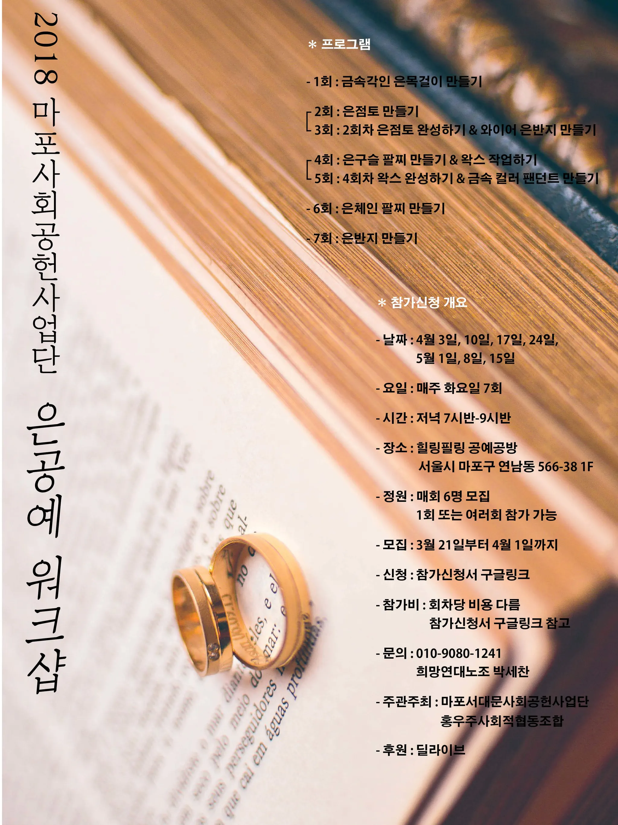 안녕하세요 조합원 여러분. 작년에 이어 올해도 희망연대노조와 함께 하는 '딜라이브 사회공헌사업' 은공예 워크샵이 열렸습니다. 올해는 연남동에 자리한 힐링필링공예공방에서 진행합니다. 참가비는 없이 소소한 재료비만 발생하니 평소에 은공예에 관심 있는 분들께 좋은 기회가 될 거 같습니다. 2회&3회, 4회&5회, 6회에만 소소한 재료비가 발생하고 1회와 7회는 재료비가 없습니다. 회당 6명 소수정원으로 진행되고 선착순으로 접수 마감이 되니 관심 있는 분들은 아래 링크로 서둘러 참가신청해주세요.
