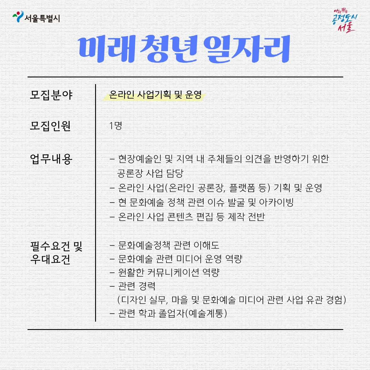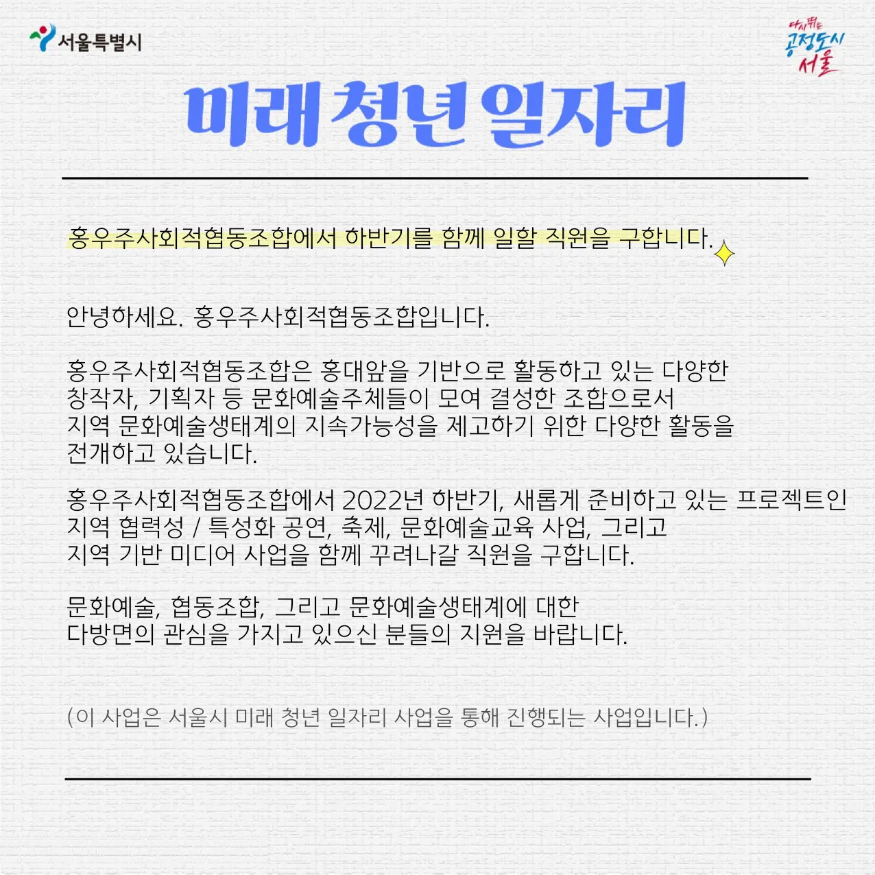 서울시 미래청년일자리사업의 일환으로 홍우주에서 하반기를 함께 일할 직원을 모집하고 있습니다.
