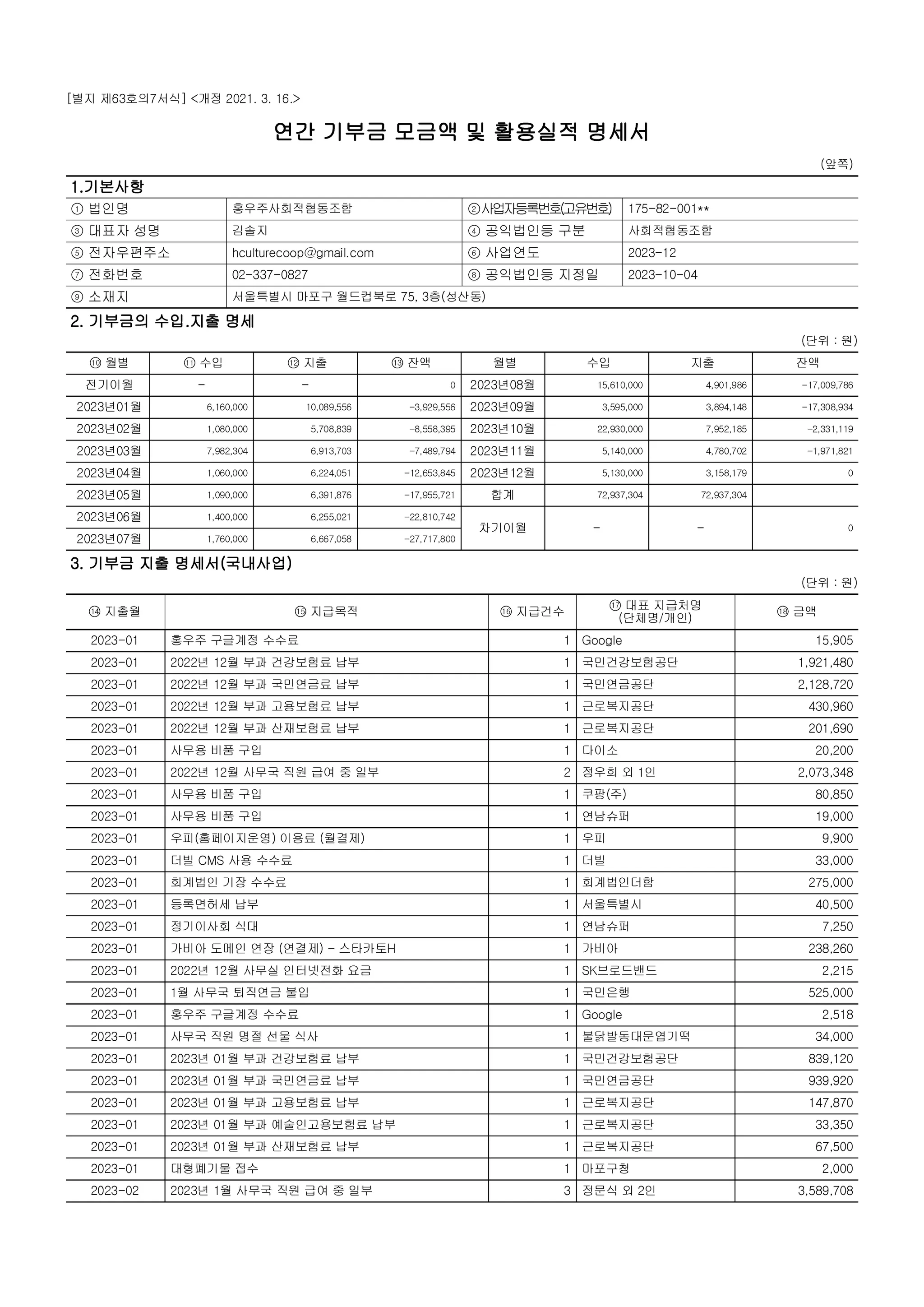 홍우주 정관 및 관계법령에 지정된 공익법인과 (사회적)협동조합의 의무사항에 따라,