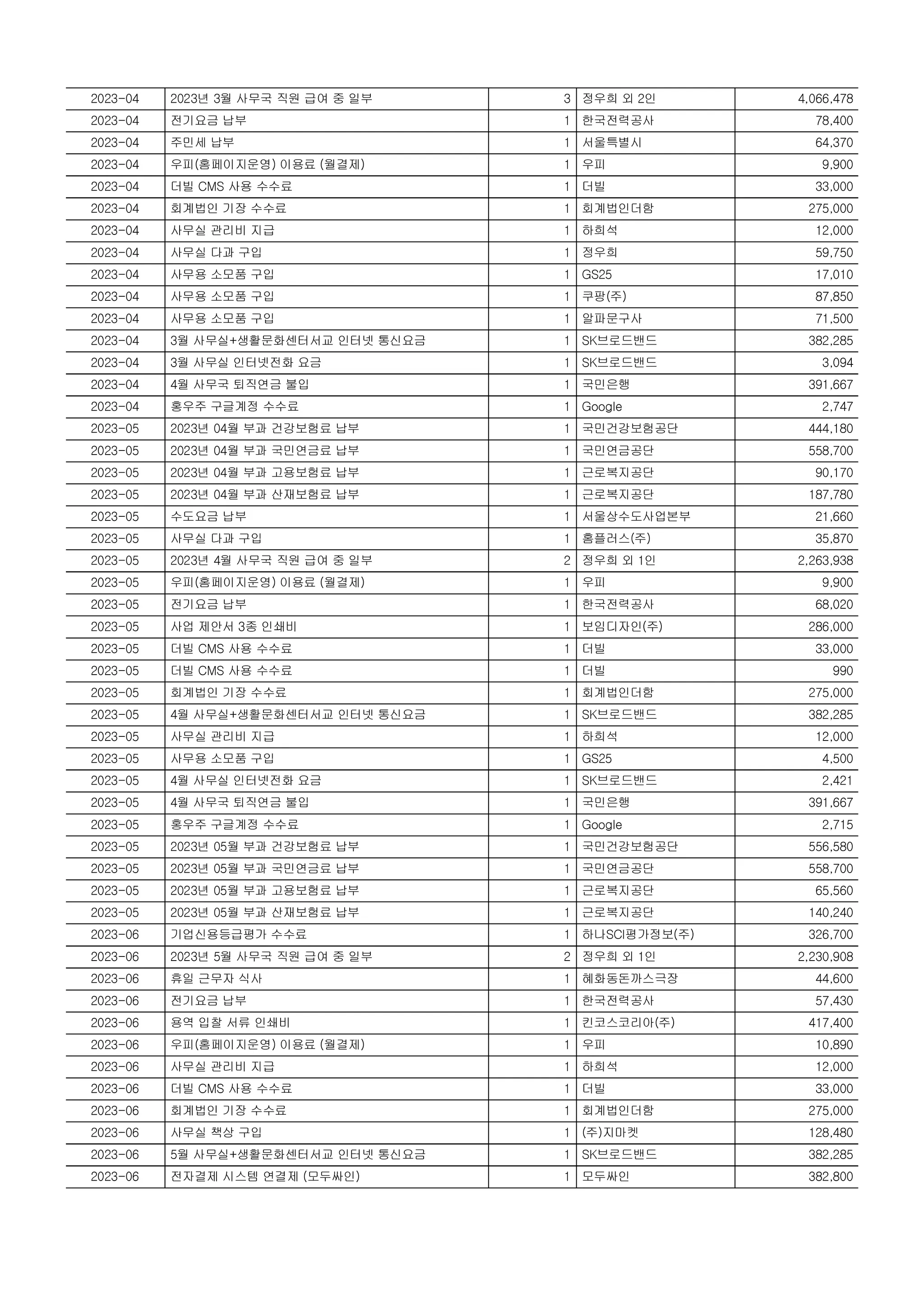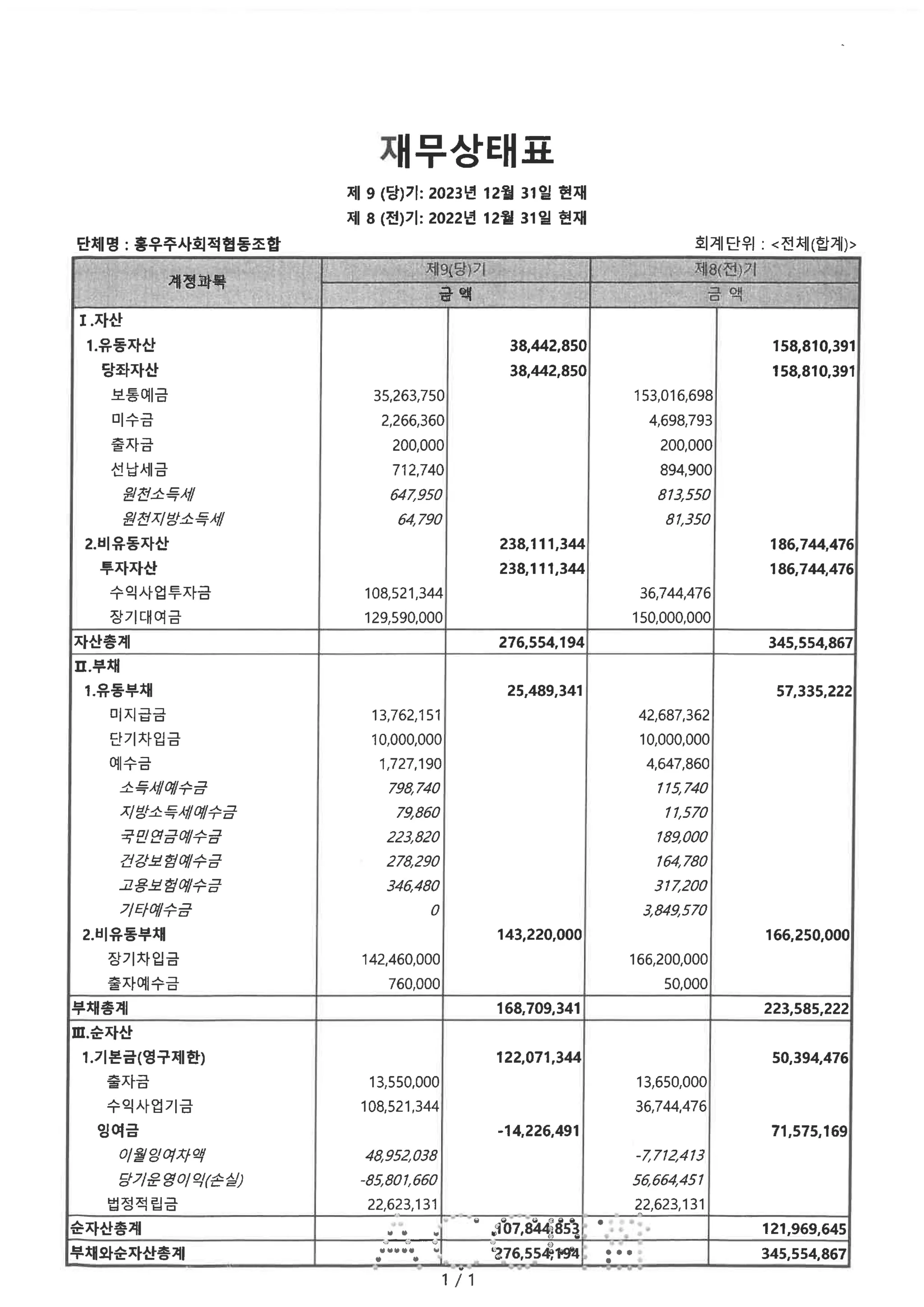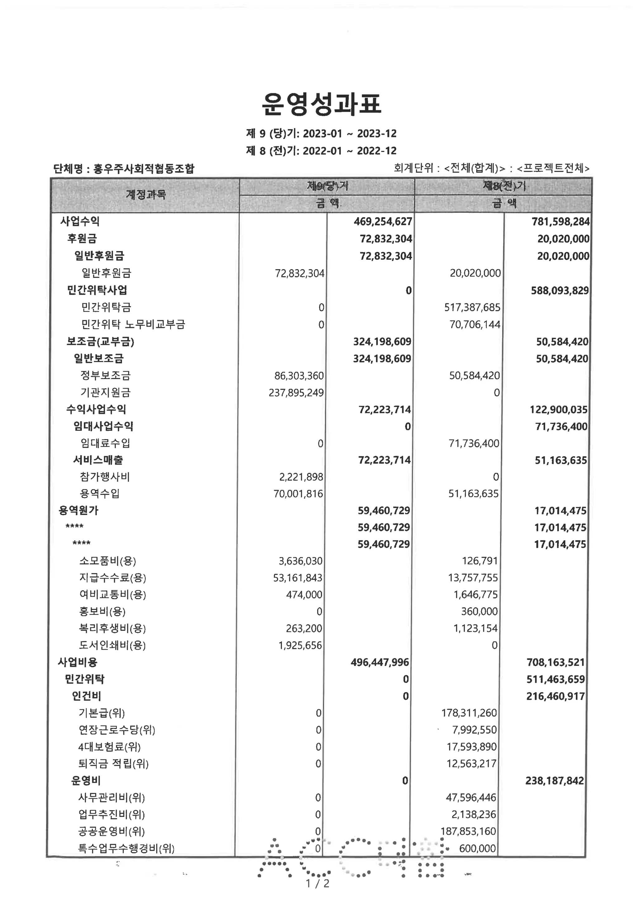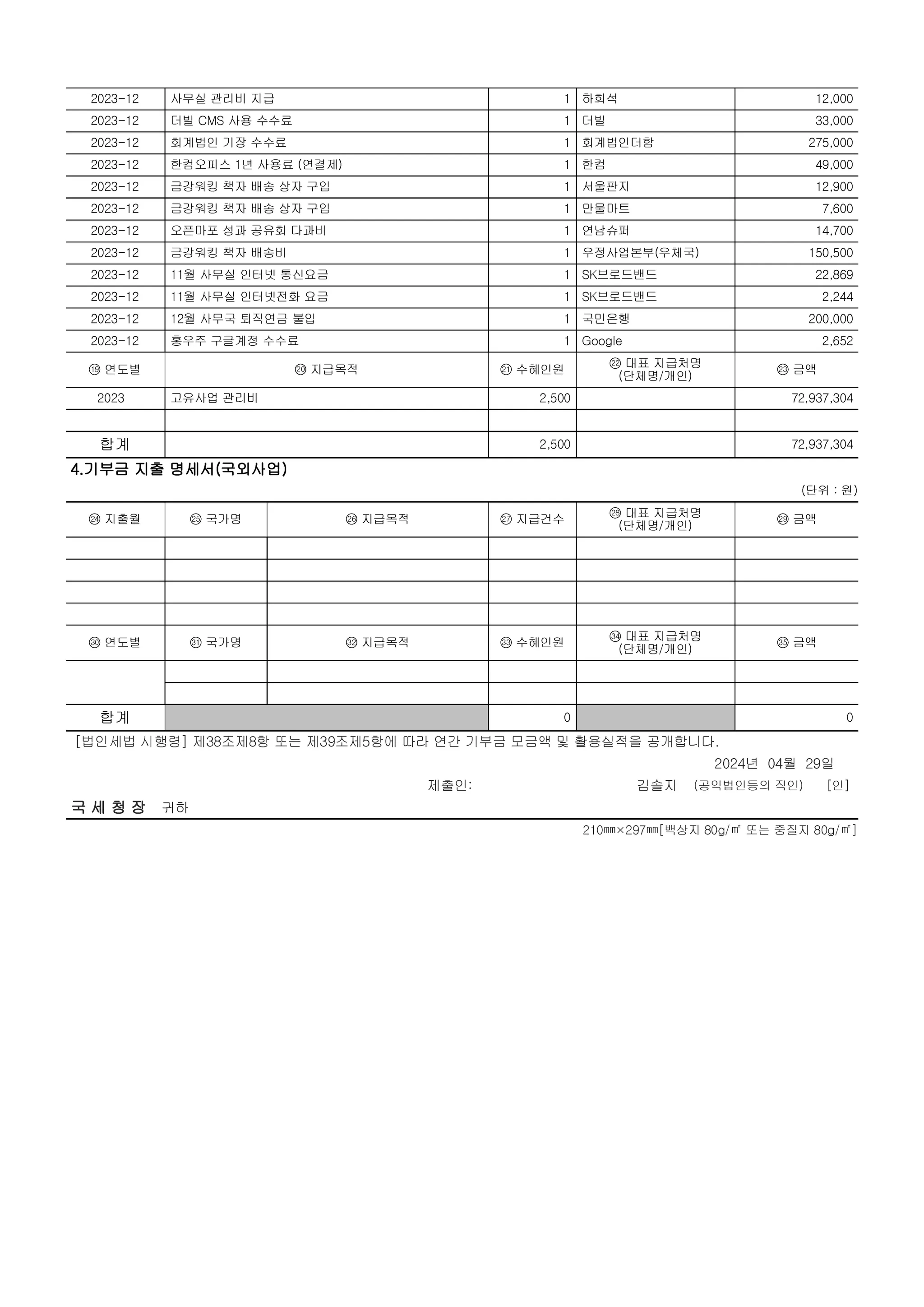 2023년 제9회기의 결산 재무제표, 연간 기부금 모금액 및 활용실적 명세서 등을 홈페이지에 공시합니다.